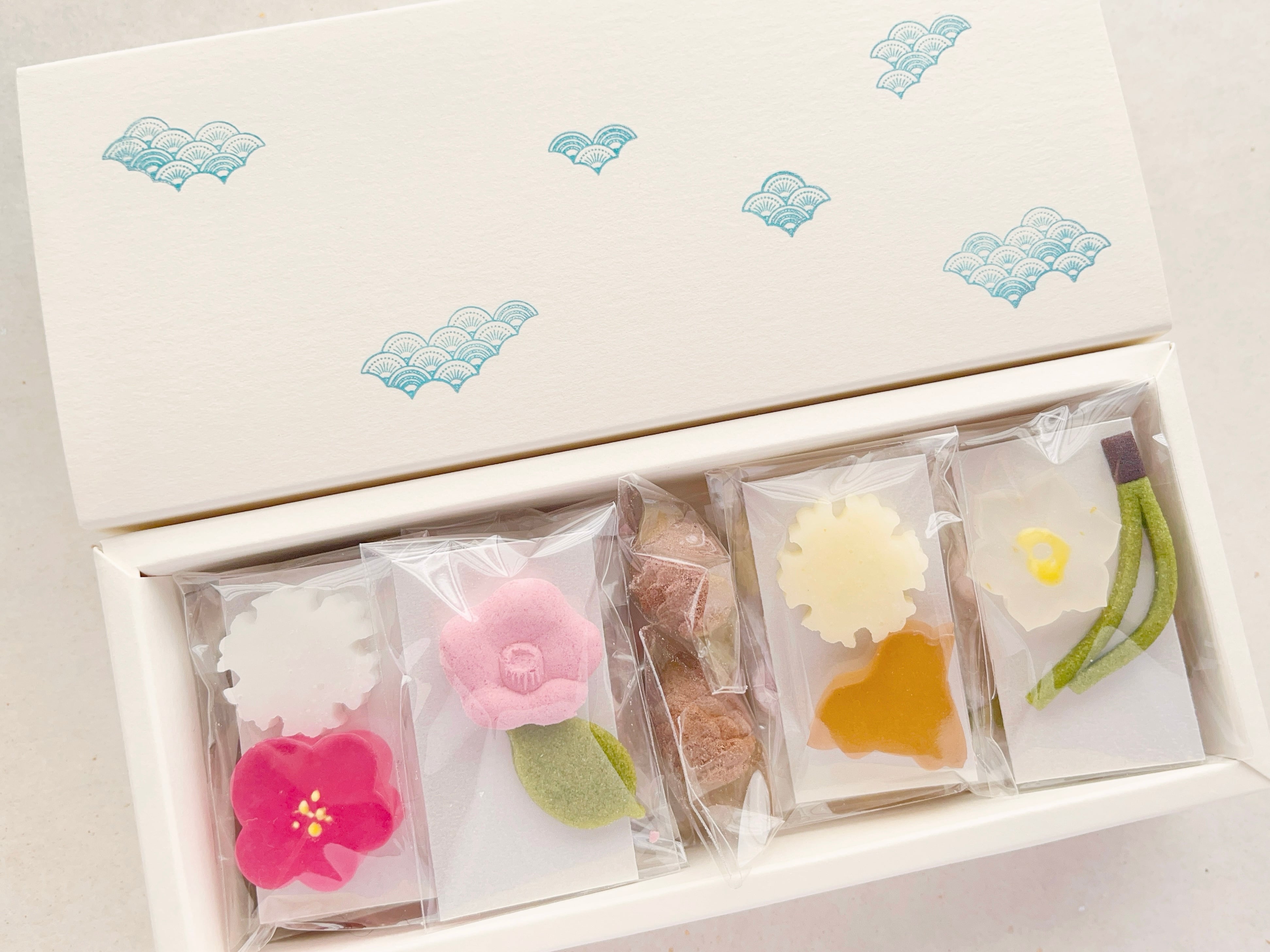 冬の花や縁起物のモチーフを象ったお干菓子、タイプやお味もさまざまです。ちょっとした気持ちで配るのにぴったりの、2つ入の小袋が16個、立体的な松ぼっくり1つ入が2つ入っているボックスです。